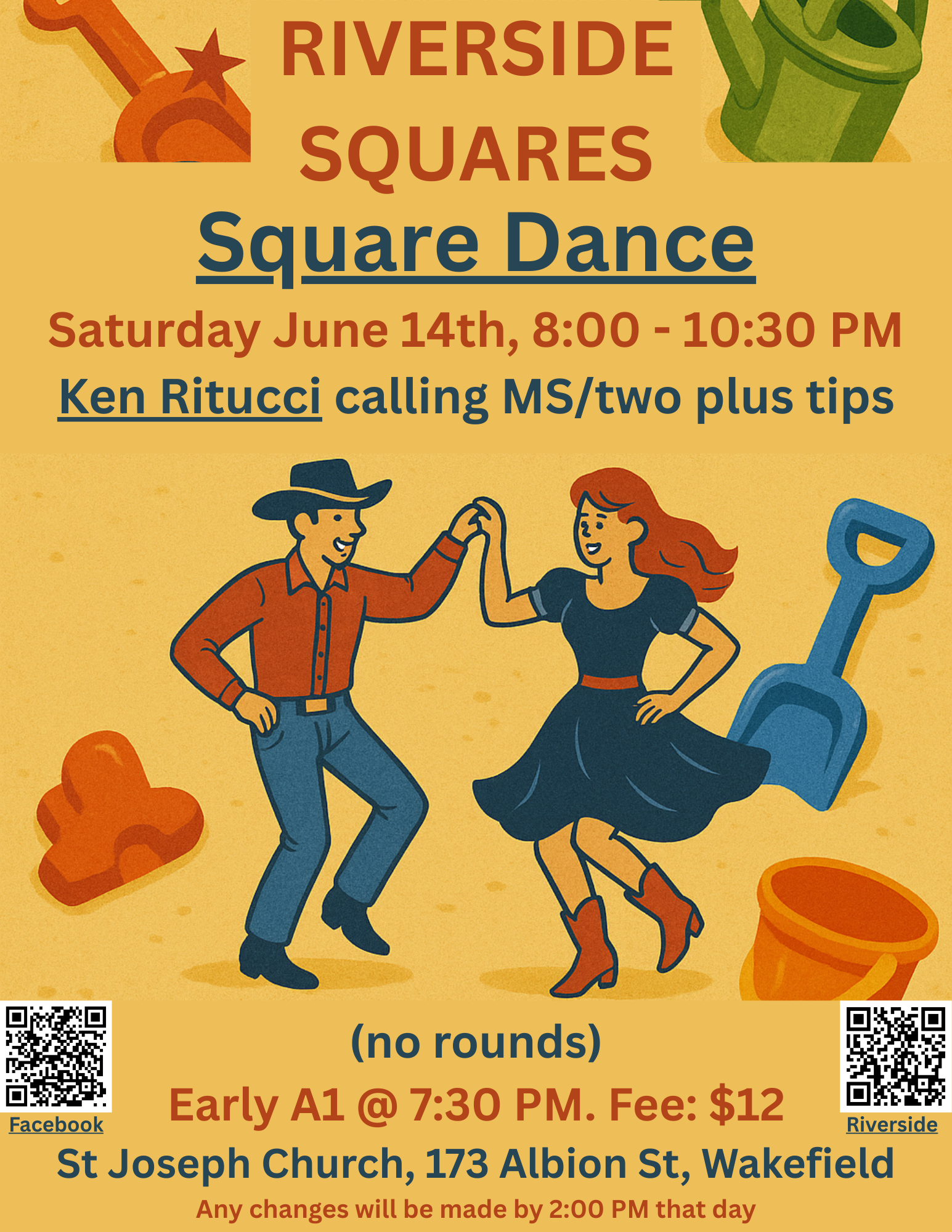 Come join us and learn how to Square Dance! We have classes that start every September and January that will teach you all you need to know about Square Dancing. Every year we take people who have never square danced and teach them what they need to know. This Spring our classes start on January 22, 2026 at 7:00 pm with a free Fun Night(Flyer). The classes will continue every Thursday evening at 7:00 at the Middleton Congregational Church in Middleton, MA with the following schedule: 7:00 to 8:30 Mainstream class and Mainstream Workshop (for new dancers) The fee for this program is $85.00 per person for the 10 week Basic Class, followed by $45.00 for the 7 week Mainstream Class. The fee for the Plus Class is $85.00. For club members and other dancers, the cost is $6.00 per night. We will start another new set of classes on September 10, 2026. Once you have learned to dance, you can join us at our monthly dances, usually held the first Saturday of each month (weather permitting) at 8:00 at Middleton Congregational Church in Middleton, MA. The dances are Mainstream or Plus level, with an early A1 tip at 7:30 pm. Please check our Schedule page for the details of a specific dances. Any changes to the schedule will be posted at the top of this page by 2pm on the day of the event. |
